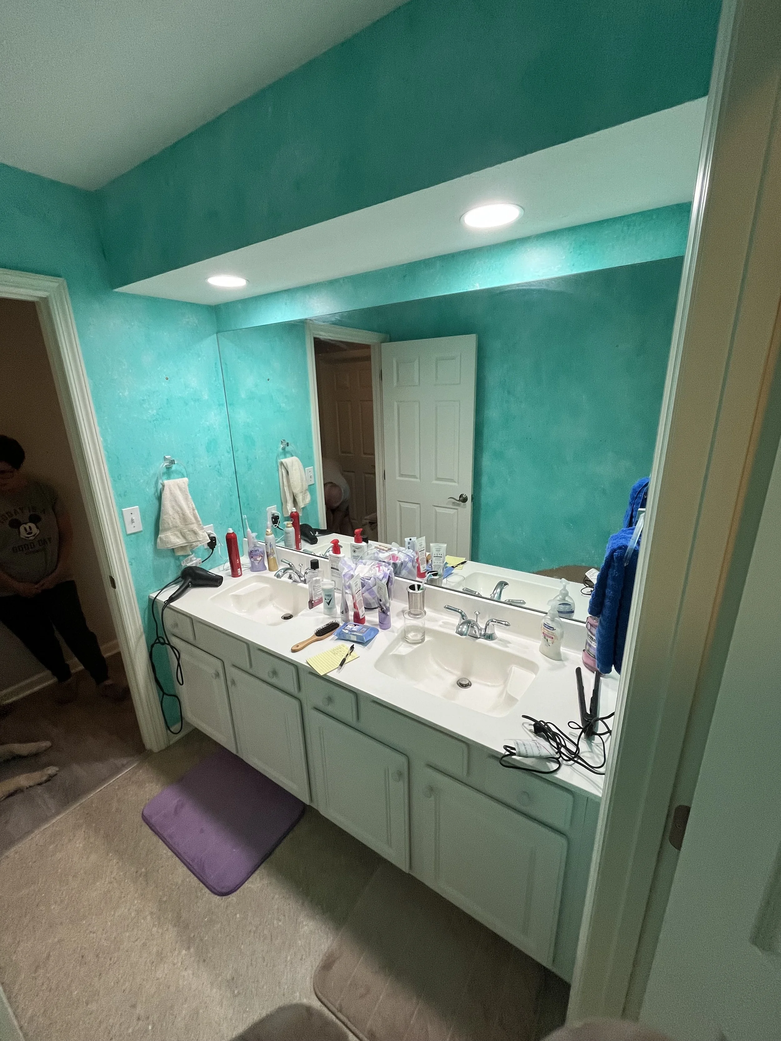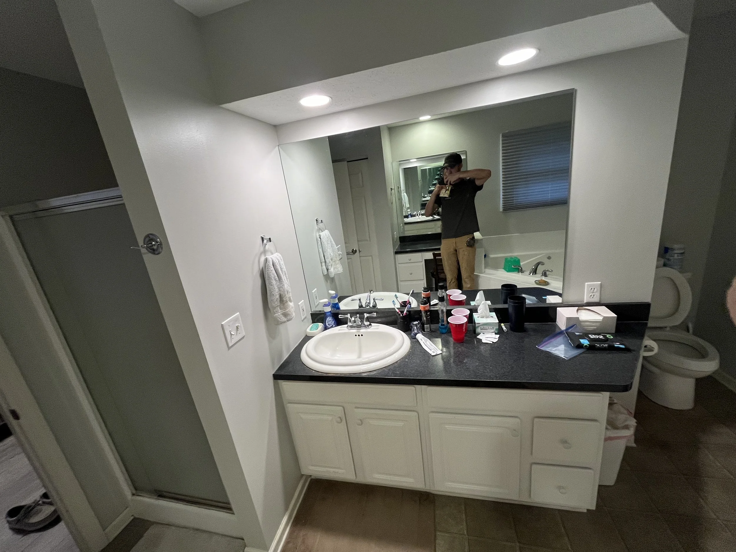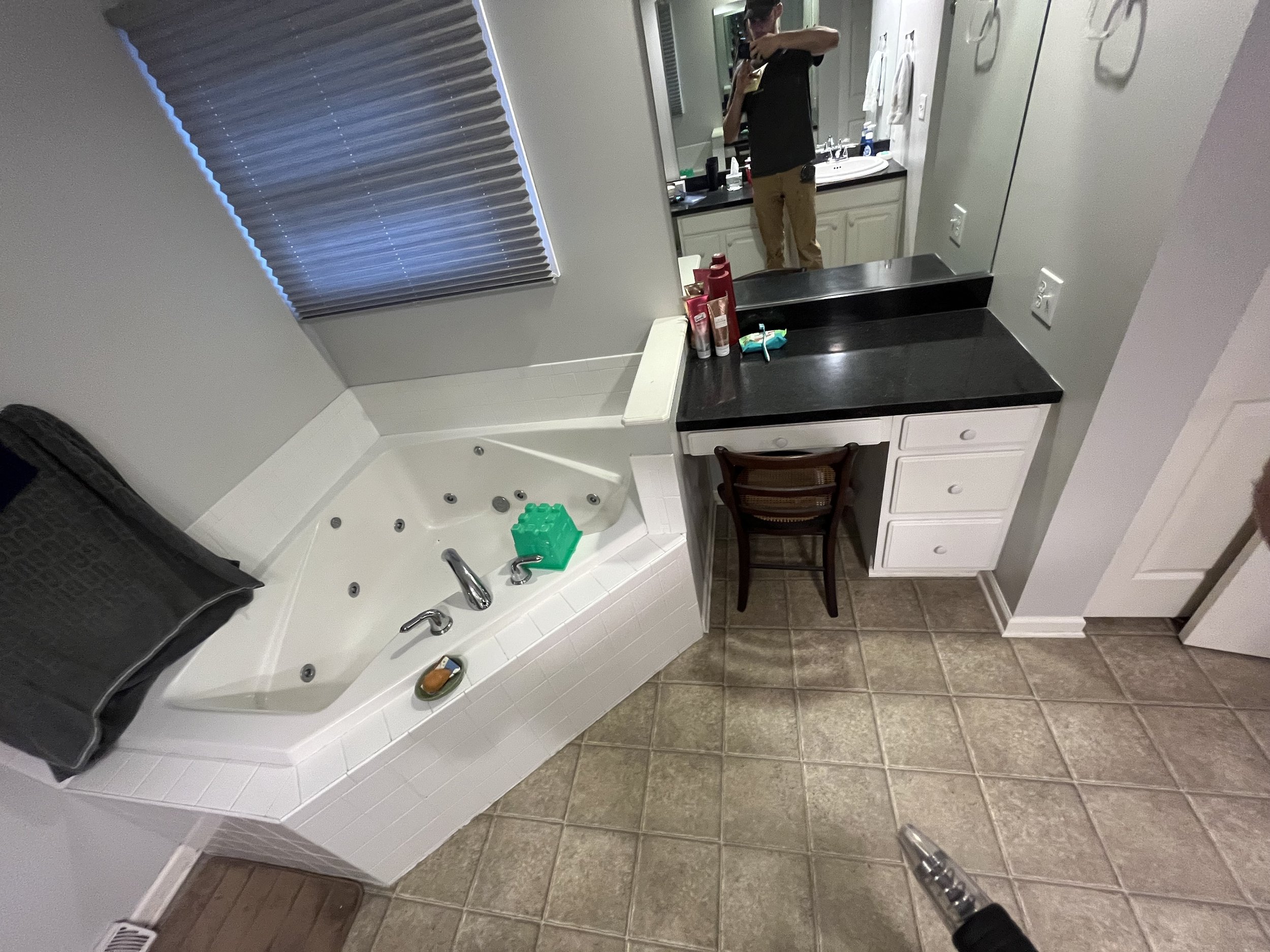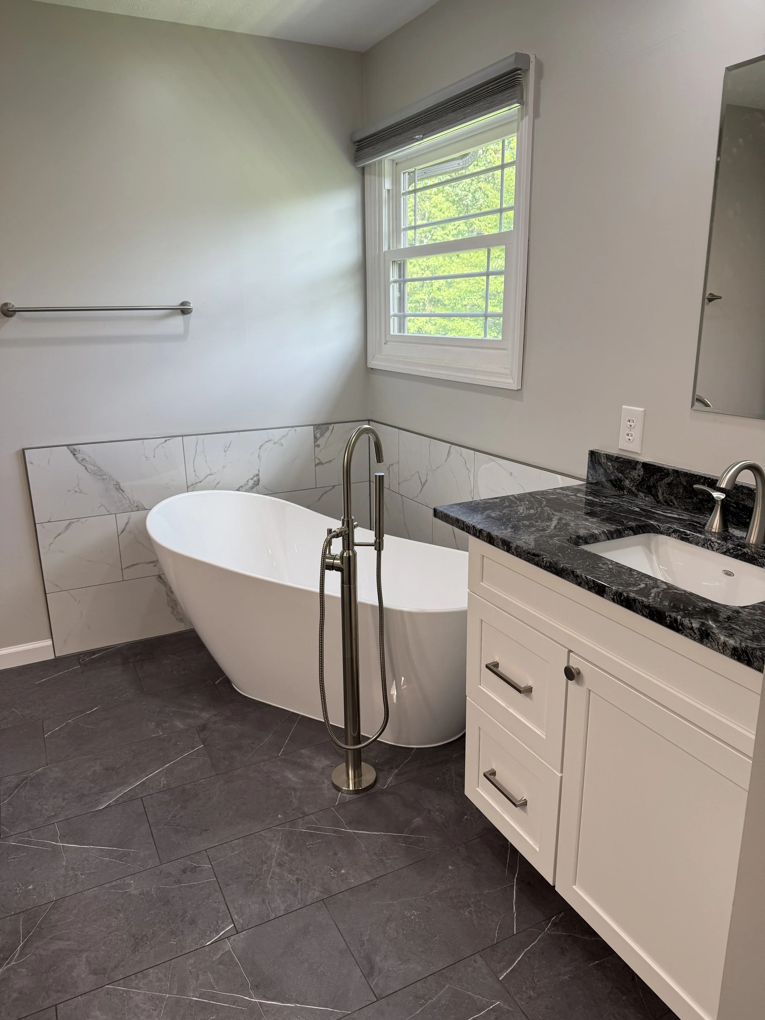 In the master bathroom, we installed a freestanding tub in place of the old soaker tub, along with a custom tile shower, two new custom vanities and countertops, and finally upgraded lighting and electrical for a brighter, more functional space.